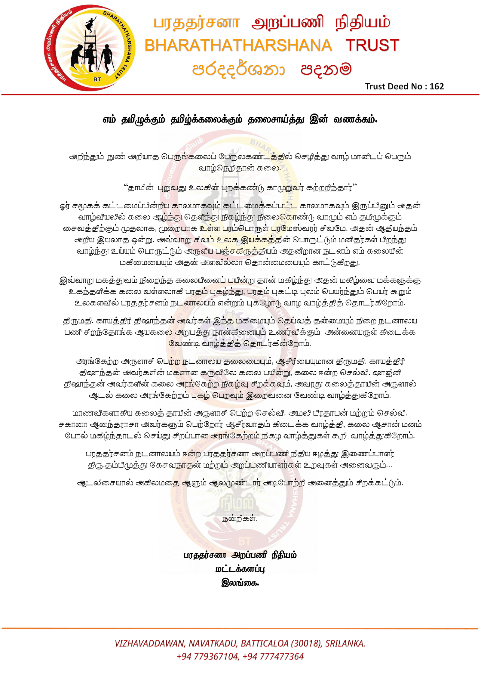 பரததர்சனம் நடனாலயம் ஈன்ற பரததர்சன அறப்பணி நிதிய ஈழத்து இணைப்பாளர் தலைவர் திரு.தம்பிமுத்து கேசவநாதன் மற்றும் அறப்பணியாளர்கள் உறவுகள் அனைவரும்.
