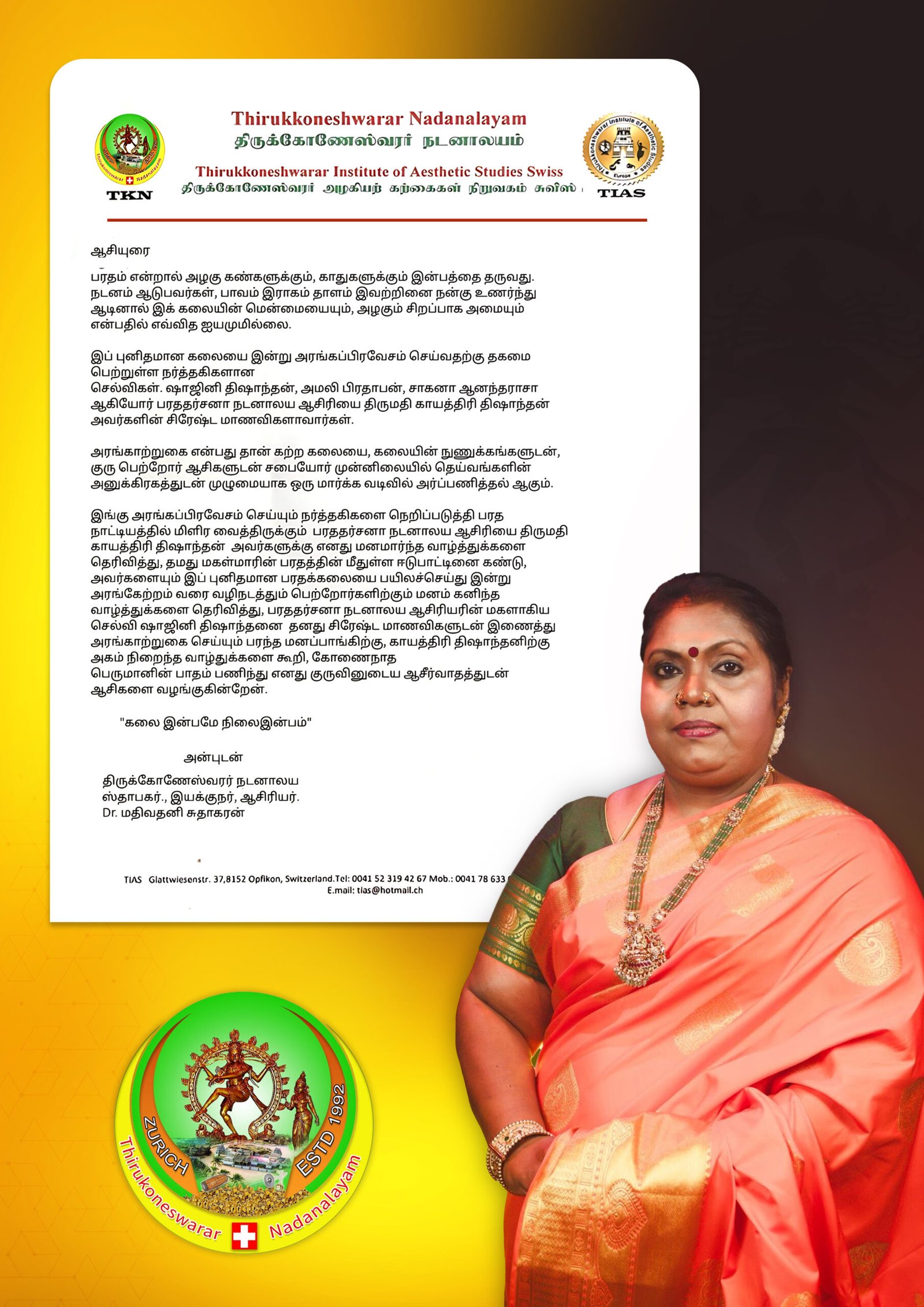 இங்கு அரங்கப்பிரவேசம் செய்யும் நர்த்தகிகளை நெறிப்படுத்தி பரத நாட்டியத்தில் மிளிர வைத்திருக்கும் பரததர்சனா நடனாலய ஆசிரியை திருமதி காயத்திரி திஷாந்தன் அவர்களுக்கு எனது மனமார்ந்த வாழ்த்துக்களை தெரிவித்து, தமது மகள்மாரின் பரதத்தின் மீதுள்ள ஈடுபாட்டினை கண்டு, அவர்களையும் இப் புனிதமான பரதக்கலையை பயிலச்செய்து இன்று அரங்கேற்றம் வரை வழிநடத்தும் பெற்றோர்களிற்கும் மனம் கனிந்த வாழ்த்துக்களை தெரிவித்து, பரததர்சனா நடனாலய ஆசிரியரின் மகளாகிய செல்வி ஷாஜினி திஷாந்தனை தனது சிரேஷ்ட மாணவிகளுடன் இணைத்து அரங்காற்றுகை செய்யும் பரந்த மனப்பாங்கிற்கு, காயத்திரி திஷாந்தனிற்கு அகம் நிறைந்த வாழ்துக்களை கூறி, கோணைநாத