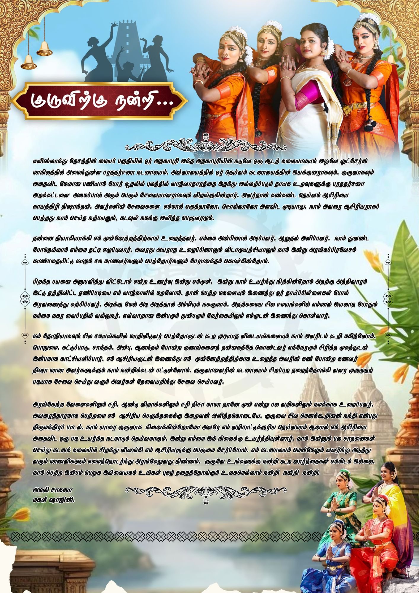 நாம் யாரை குருவாக நினைக்கின்றோமோ அவரே எம் வழிபாட்டுக்குரிய தெய்வமாம் ஆனால் எம் ஆசிரியை அதைவிட ஒரு படி உயர்ந்த நடமாடும் தெய்வமாகும். இன்று எம்மை இந் நிலைக்கு உயர்த்தியுள்ளார். நாம் இன்னும் பல சாதனைகள் செய்து நடனக் கலையில் சிறந்து விளங்கி எம் ஆசிரியருக்கு பெருமை சேர்ப்போம். எம் நடனாலயம் மென்மேலும் வளர்ந்து அடுத்து வரும் மாணவிகளும் எமைத்தொடர்ந்து அரங்கேறுவது திண்ணம். குருவே உங்களுக்கு நன்றி கூற வார்த்தைகள் எம்மிடம் இல்லை. நாம் பெற்ற இன்பம் பெறுக இவ்வையகம் உங்கள் புகழ் தழைத்தோங்கும் உலகமெல்லாம் நன்றி நன்றி நன்றி.