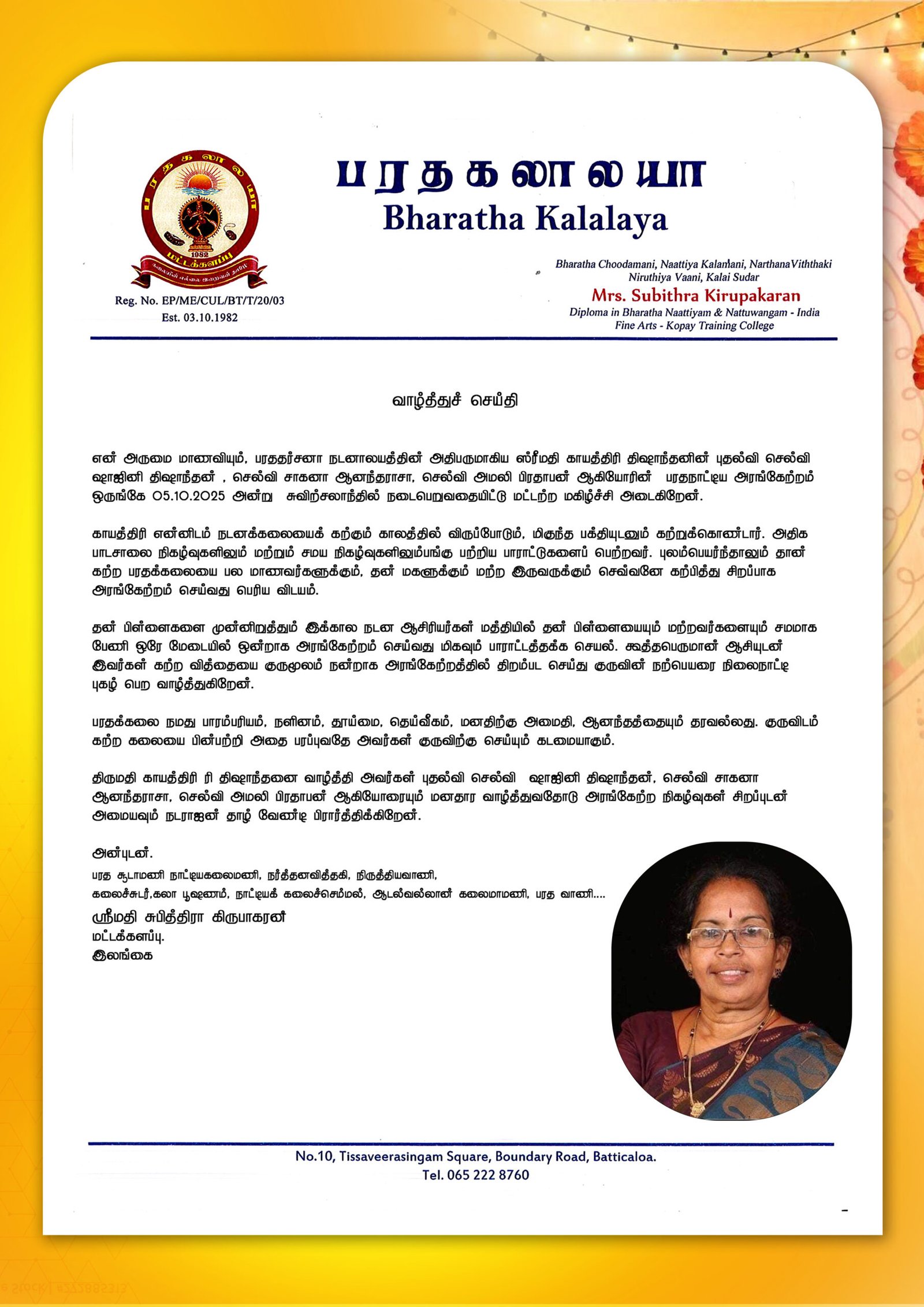 என் அருமை மாணவியும், பரததர்சனா நடனாலயத்தின் அதிபருமாகிய ஸ்ரீமதி காயத்திரி திஷாந்தனின் புதல்வி செல்வி ஷாஜினி திஷாந்தன். செல்வி சாகனா ஆனந்தராசா, செல்வி அமலி பிரதாபன் ஆகியோரின் பரதநாட்டிய அரங்கேற்றம் ஒருங்கே 05.10.2025 அன்று சுவிற்சலாந்தில் நடைபெறுவதையிட்டு மட்டற்ற மகிழ்ச்சி அடைகிறேன்.