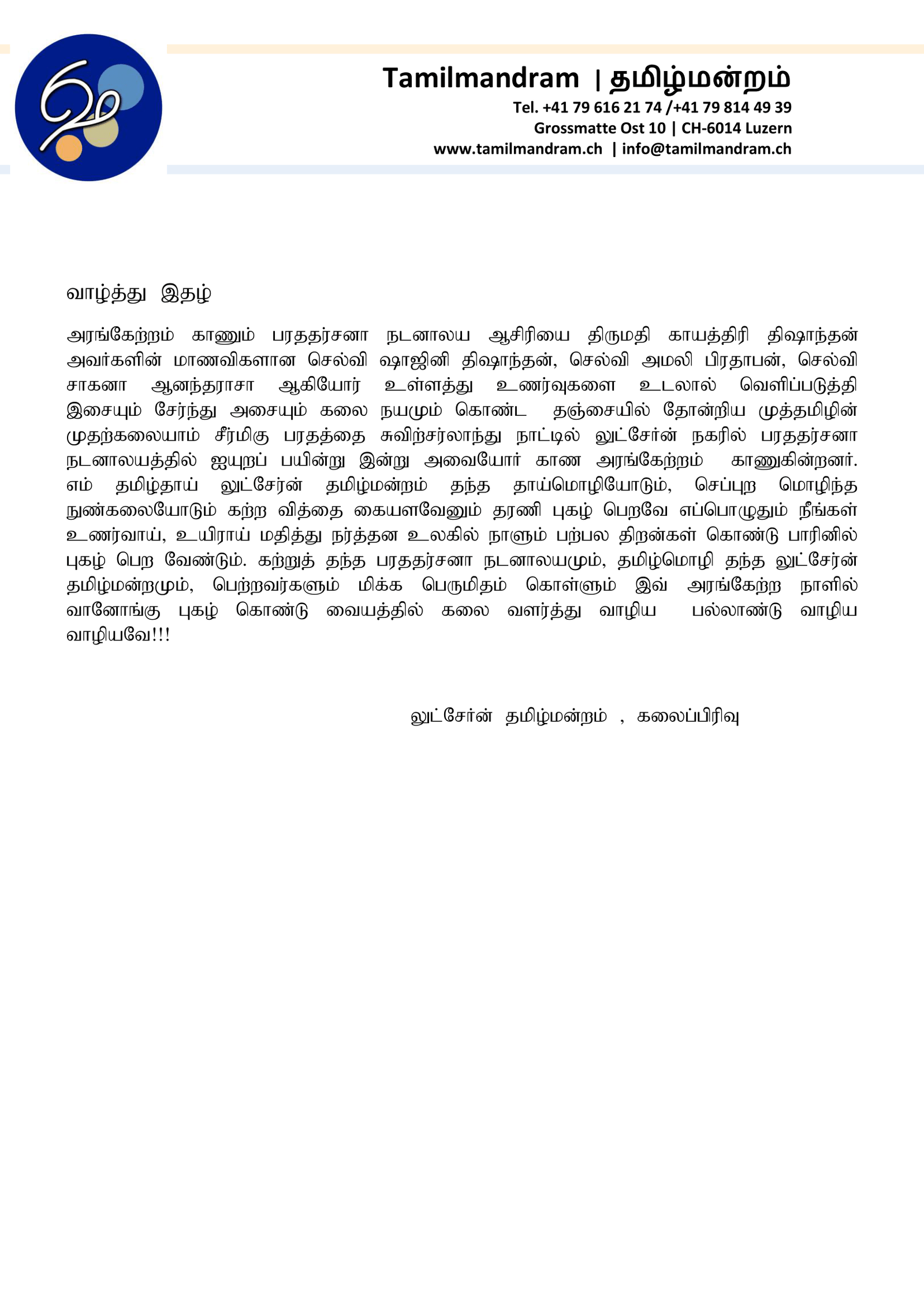 வாழ்த்து இதழ் – லுட்சேர்ன் தமிழ்மன்றம், கலைப்பிரிவு