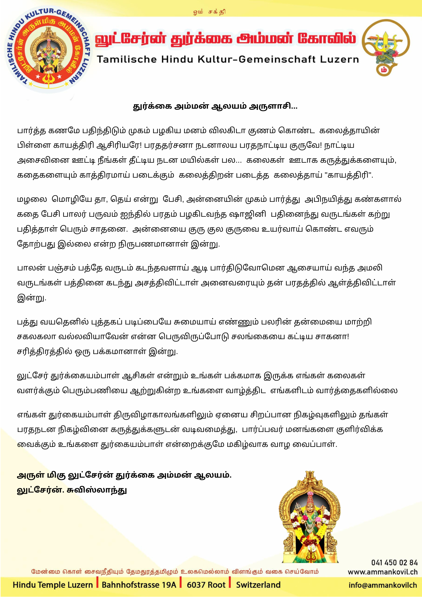 எங்கள் துர்கையம்பாள் திருவிழாகாலங்களிலும் ஏனைய சிறப்பான நிகழ்வுகளிலும் தங்கள் பரதநடன நிகழ்வினை கருத்துக்களுடன் வடிவமைத்து, பார்ப்பவர் மனங்களை குளிர்விக்க வைக்கும் உங்களை துர்கையம்பாள் என்றைக்குமே மகிழ்வாக வாழ வைப்பாள்.
